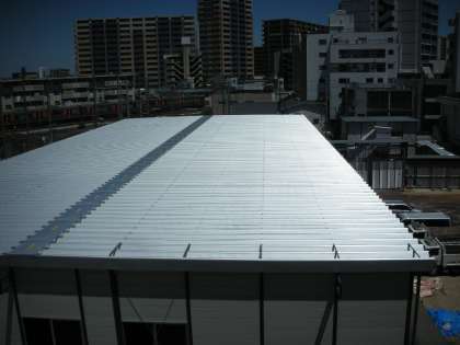 西館から撮影した仮設校舎の屋根です。強い日差しが降り注いでいます。