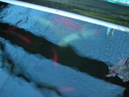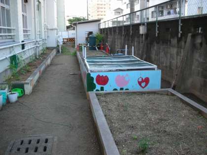 南館玄関にあった池は、撤去されました。池の鯉は西館理科室裏のもう一つの池に引っ越しています。「元気かな?」と思い、覗いてみると元気に泳いでいました。今は、めだかと同居しています。気温が高くなってきたこともあり、活発に泳いでいます。