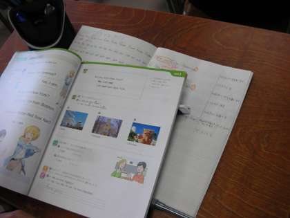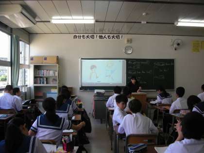 英語の授業もICTを活用した授業を行っています。パソコンに資料を入力し、それをプロジェクターを使って大きくスクリーンに映し出しています。生徒たちは、自然に頭をあげるので、正しい姿勢で発音することができます。英語の発音にも注意を払って、大きく伸びてほしいものです。