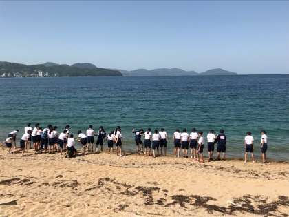 2組B班D班と3組は、浜辺へ移動して磯観察です。海の生き物が見つかるかな。