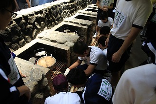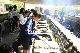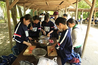 野菜を切っている人、かまどの火をおこしている人等、役割は様々です。おいしいカレーライスができたかな?