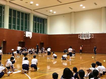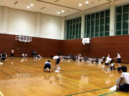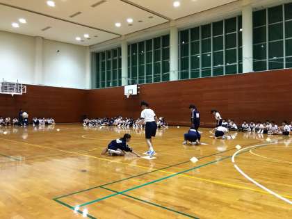 続いての種目は短距離走です。2人1組で、1人が2枚の紙を交互に、次々につないでいき、もう1人がその上を進んでいきます!