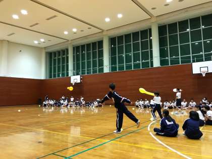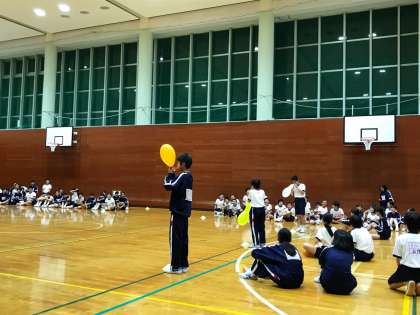 次の種目は砲丸投げです。1分間でふくらませた風船を飛ばし、いちばん長い距離を飛ばせたチームが優勝です。大きくふくらんだ風船、いったいどこへ飛ぶかわかりません!