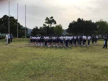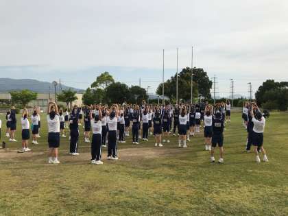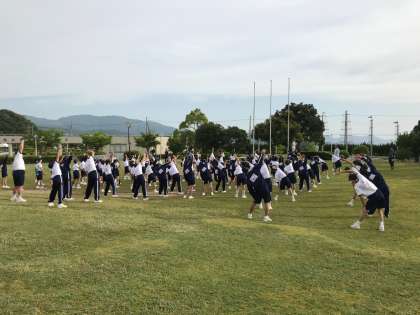 一泊移住2日目の朝を迎えました。眠い目をこすりながら、広い芝生広場で朝の集いです。先生方からの諸注意の後、ラジオ体操、校歌斉唱を行いました。