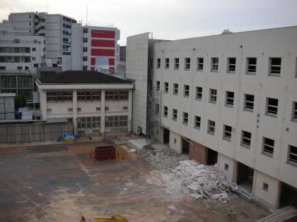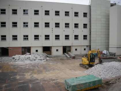 さて、南館の工事は、順調に進んでいます。校舎内部の解体がかなり進んでいるようです。鉄筋コンクリートの大きな塊は、細かく砕いて、コンクリートと鉄筋を分別しています。しっかりと材質ごとに分けて再利用できるようにしているそうです。