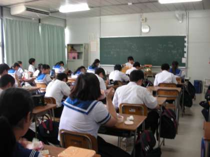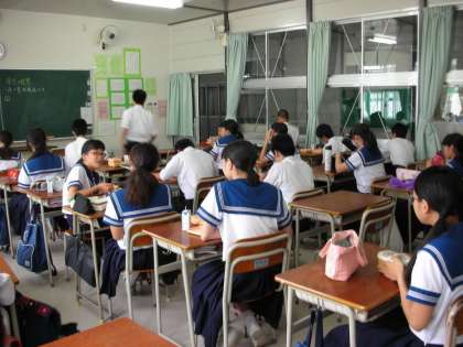 2年生の昼食時間の様子です。今日の給食についての生徒の意見は、「おいしいです」「まあまあです」というものが大半でした。