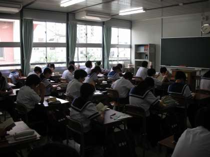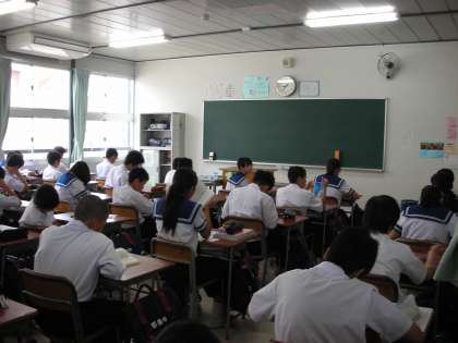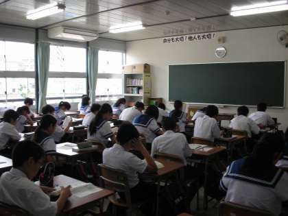 朝の約10分間、毎週金曜日は、『新聞のチャレンジ』という取組を行っています。最近は、新聞に親しむ機会が少なくなっているそうです。そこで、新聞を活用して、生徒たちに様々なことを考えて、世間のことを知り、様々なことを考える取組です。みんなよく考えています。早くできた人は、読書をしています。