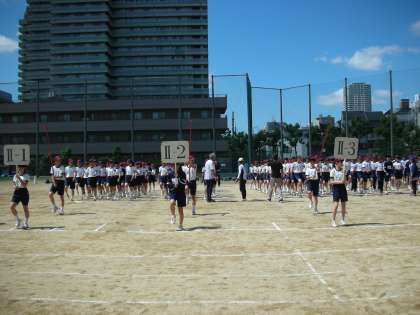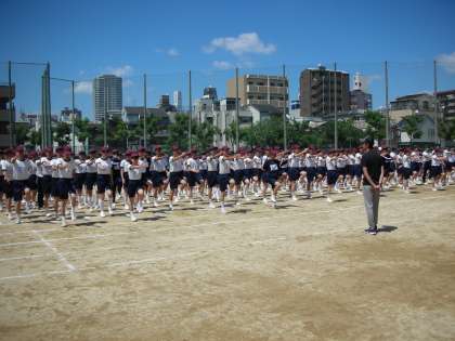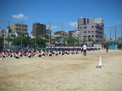 入場行進の基本練習を行いました。その後、入場行進を行いました。堂々と歩いているのですが、全員で行うと、どうしても速く歩きすぎて、前後の間隔が詰まってしまうクラスも出てきます。このあたりを調整しました。暑い中ですが、みんな頑張っていました。
