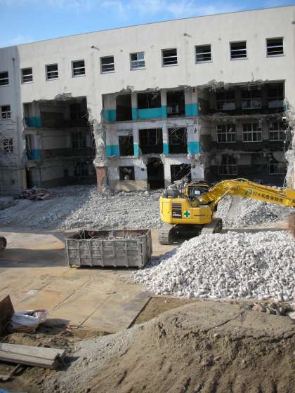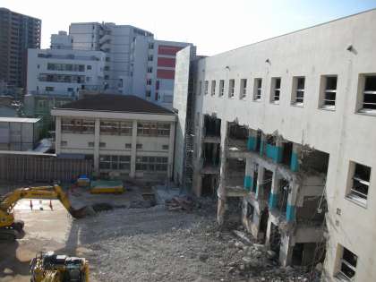 工事現場は、朝日に照らされ、解体されている姿が良く見えます。校舎は、解体されても都島中の歴史と伝統は、毎年積み重なっていきます。生徒の皆さんの日々の学校生活自体が本校の歴史の積み重ねになっていくのです。健康に気を付けて、日々頑張っていきましょうね。