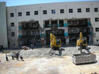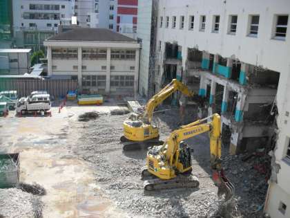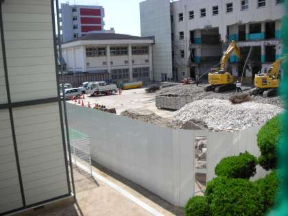 バックフォーの点検をして、工事現場に水をまき、ほこりがたたないようにしてから、作業の開始です。今日は、どこまで進むのでしょうか。楽しみです。