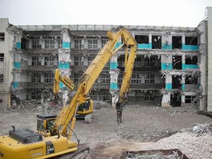 本日の工事が始まる前は、4階部分がすべて残っていました。しかし、終了後には、左側の2列が屋上まですべて解体されてしまっています。大型の重機がどんどん解体し、小型の重機がその破片をさらの細かく粉砕して、コンクリートと鉄筋とを分けています。見事なコンビネーションです。
