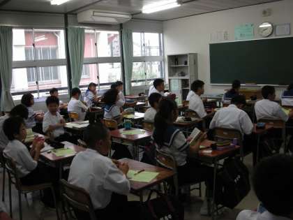 1年生は、一泊移住のお礼状を書いています。書き終わった人は、読書をしています。