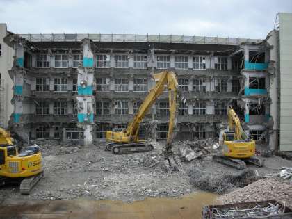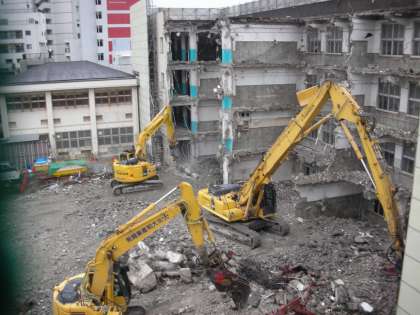お昼休みの工事の様子です。本当に工事の進み具合がはやいです。南の端の窓ガラスがはいいている壁だけが残っています。小型の重機は、コンクリート片を砕いて、金属を分別しています。