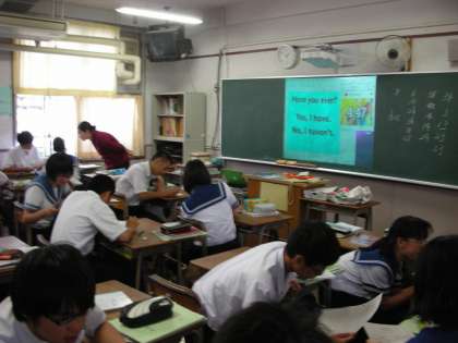 今日はCネットのエイドリアン先生を交えた英語の授業です。パソコン、プロジェクター、スクリーンを使って、教材が示されています。