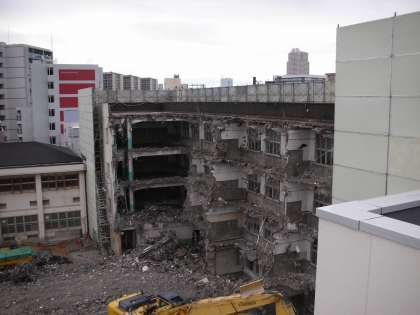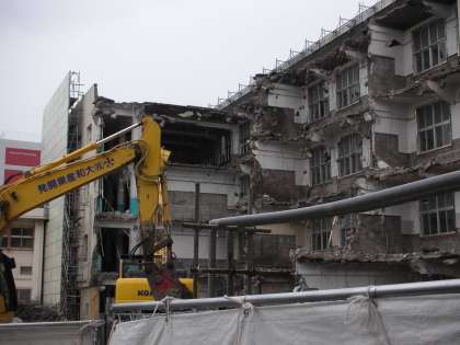 さて、工事の状況ですが、ご覧のように、南館の教室があった部分は、ほとんど解体され(空間になっています)、窓が設置されている壁1枚の状態になりました。東西の階段とピロティー部分が残っています。この後どのように解体されていくのか、楽しみですね。