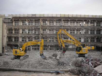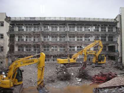 わかりにくいのですが、写真の左側をご覧ください。屋上から4階の窓にかけてすでに解体されています。左奥の階段部分もほとんどなくなっています。これから順次上から下に向かって解体が進んでいくと思われます。