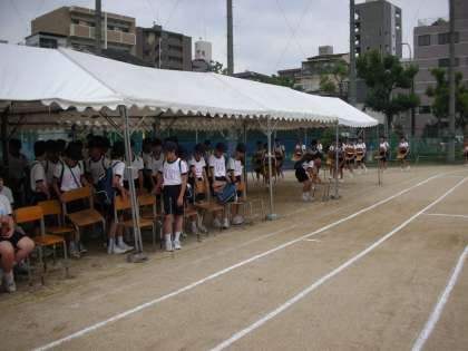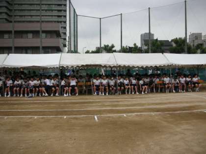 生徒たちは、椅子を持って移動してきました。椅子を自分のクラスのテントの下に置き、着席しています。3年生、2年生、1年生の順に到着してきます。