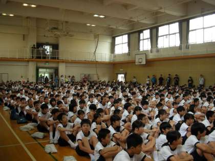 全校生徒が体育館に集合し、あらかじめ抽選により決まった順番で応援が始まります。 生徒の後ろに大勢の保護者の方が見つめておられます。