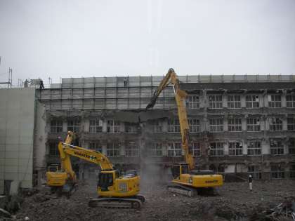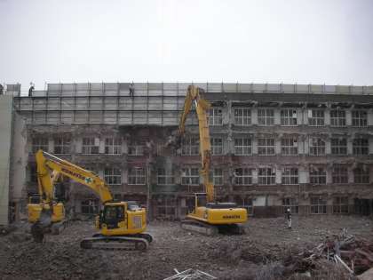 南館の屋上と4階の壁が撤去され始めました。「ガラガラ、どっすん」と、音を立てながらコンクリートの塊が落ちていきます。大型の重機は屋上や4階まで届くので、確実にその解体が進んでいきます。どんどん解体されていきます。来週月曜日には、どのようになっているのでしょうね。