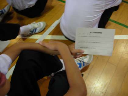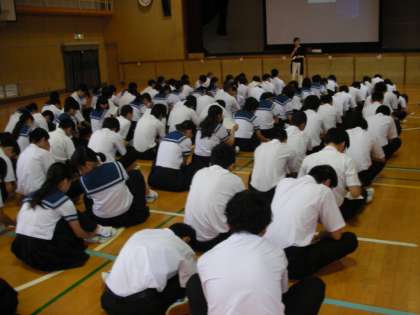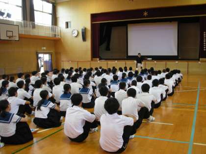 3年生は、全校集会に引き続き、体育館で進路学習会を行いました。進路指導主事の藤原先生からお話を聞いて学習しました。