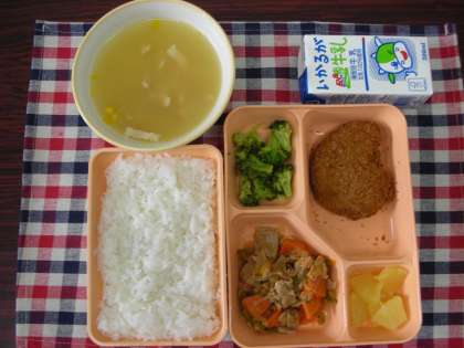 今日の給食は、とてもおいしくいただきました。コーンスープは、科洋室でもおかわりをしている人が多くいたそうです。チキンカツも豚肉と野菜のケチャップソテーもおいしかったです。