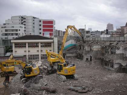 2階の東側の壁を挟んで手前に落とそうとしています。力がかかった瞬間に、がたがたと崩れ落ちました。小型の『バック フォー』は、崩れ落ちたコンクリートをさらに細かく砕き、中の鉄筋とコンクリートとを分別しています。チームワークですね。