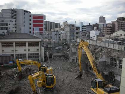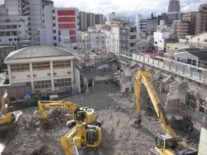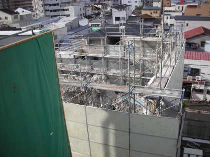 さて、写真は、屋上から見た南館です。高さが確実に低くなってきているのがわかりますね。ほぼ2階よりも低くなっています。解体されるにつれて、足場も低くなってきています。校長室からは、南館の後ろ側に立っているマンションが見えるようになってきました。大型重機のお勤めは、今日までです。もうひと頑張り、お願いします。
