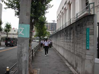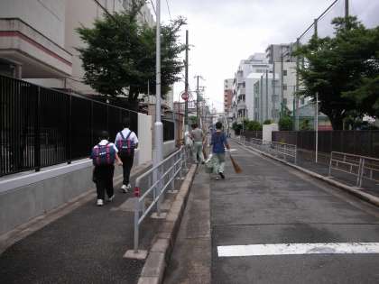 今日は、傘を持たずに投稿する生徒が多いようです。正門前は、歩道が狭いので、風紀委員の人は、体育館前に立ってあいさつ運動をしています。