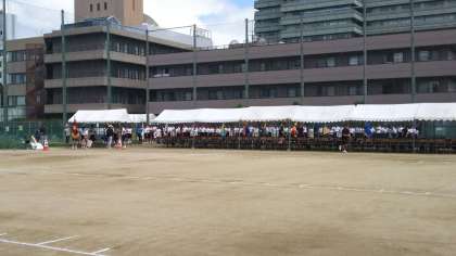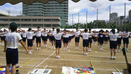 体育大会が始まりました。生徒はみんな「ウキウキ」しています。座席にいるときの様子とラジオ体操の様子です。