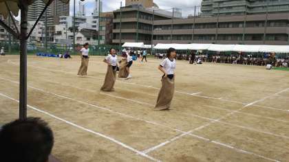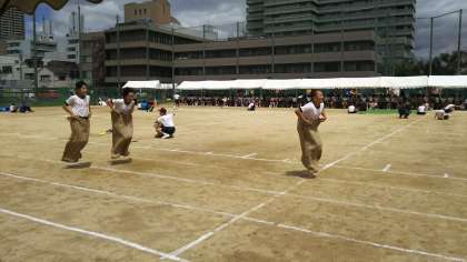 風雲、M1競争です。ネットをくぐり、縄跳びをし、コーンを飛び越え、トンゴロスに入り、ジャンプしながらゴールを目ざします。勢い余って、転んでしまうこともあります。みんな頑張っています。