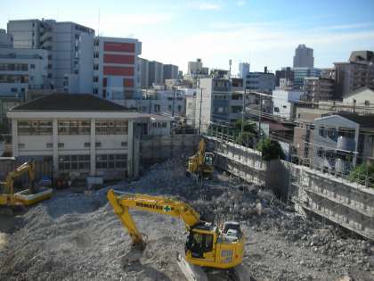 さて、昨日は、一日中第2グラウンドで過ごしていました。学校に戻ると本当に驚きました。南館の1階部分がほとんど解体されています。西側の階段部分がまだ少しだけ残っているという状況です。また、大きな重機が学校を去りましたが、新たに小型の重機が鉾ばれてきました。4台のそろい踏みです。ご覧のように、がれきが1階と2階の間くらいの高さまで積まれています。これから、解体作業とがれきの搬出を同時進行で行うようです。完全に解体された後は、基礎部分を撤去して新たな南館の建設に移っていきます。どのような建物ができるのか、本当に楽しみですね。