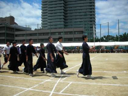 続いて、剣道部、ソフトテニス部の行進です。剣道部は、本当に暑そうですね。