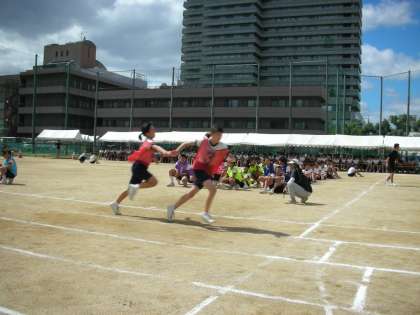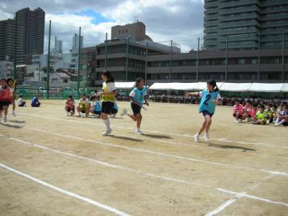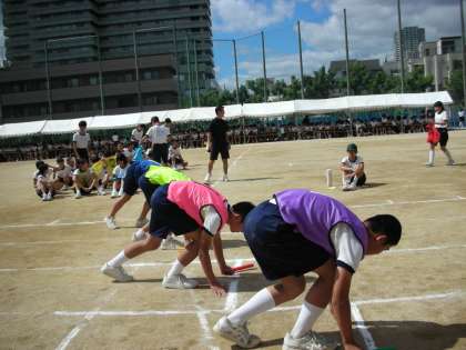 男女別に行うリレー種目です。全員勝利を目ざして一生懸命です。スピードが上がると、カーブでの走り方が大きなポイントになったようです。インコースを走ると、走る距離は短くなって得をするのですが、曲がる角度が厳しい状態になるので、転倒することもしばしばあります。この課題を克服したチームが良い結果を出したようです。