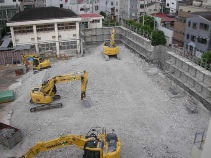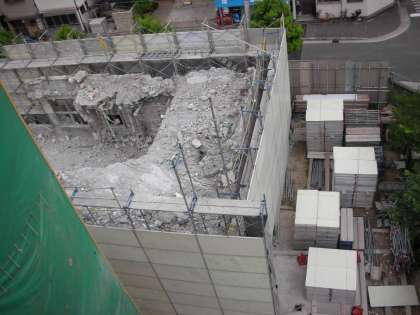 写真は、西館屋上から撮影したものです。上は、南館の西側の端の部分です。1階がまだ少しだけ残っています。がれきの搬出と並行して、この部分の解体が行われると思います。