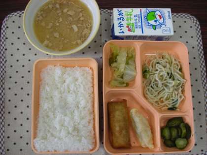 昨日は、味噌ラーメン(炒めめんとみそスープ)、揚げ点心、キャベツの炒めもの、キュウリの中華漬けでした。生徒に聞くと、「春巻きとギョウザ」が特においしかったと言っていました。味噌ラーメンは、炒め麺を味噌スープにつけ麺風にして食べている人もいました。なかなか好評でした。
