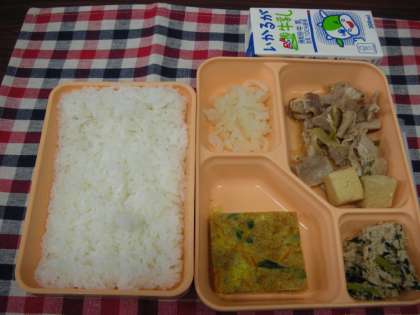 下の写真は、今日のものです。豚肉の甘辛煮、千草焼き、だいこんの甘酢あえ、ツナッ葉炒めでした。豚肉は、脂身が気にならず、しっかりと味がしみ込んでいて、おいしくいただきました。千草焼きはあっさりとした味付けで、こちらもおいしかったです。