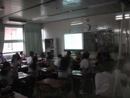 1組は、英語の時間です。C’netの先生を交えて、会話中心の授業を展開しています。パソコンの教材をプロジェクターを使って、スクリーンに映し出しています。