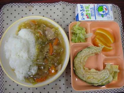 本日は、和風あんかけ丼、かぼちゃのてんぷら、卵焼き、キャベツの即席漬け、オレンジでした。
