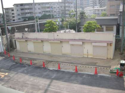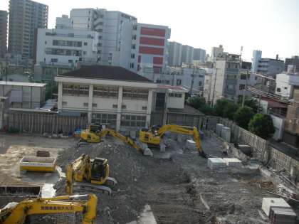 さて、上の写真は、西館4階から撮影した旧南館付近です。コンクリート片が撤去され、ついに旧南館の基礎部分が現れてきました。最終的にはこの部分も解体されるそうです。よく見ると、新しい足場と工事用囲いの部材が運び込まれています。どんどん工事が進んでいきますね。