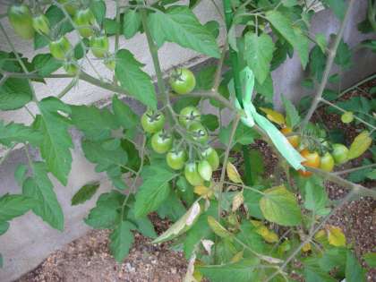 西館の校舎裏にニーズルームとボランティア部が育てている畑があります。ミニトマトがまだ緑色ですが、鈴なりに実をつけています。