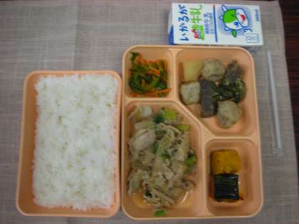 本日は、豚肉のしょうが焼き、一口ごぼう天とじゃがいもの煮物、かぼちゃの甘みつ焼き、ピーマンの炒めものでした。