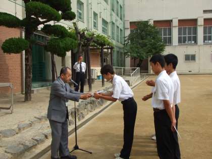 6月16日(月) 全校集会で伝達しました。5月30日(土)にあった合同研修大会で入賞してきた生徒たちです。個人準優勝、団体準優勝でした。