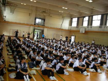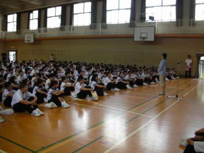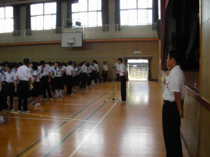 毎週月曜日には、体育館で全校集会を行います。集合状態は、最近、とても良いです。生徒の皆さんは、良く頑張っています。