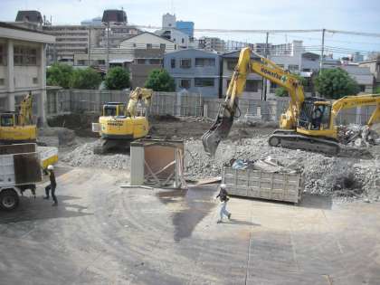 体育や運動部が使っていた石灰の倉庫が解体されました。南館の工事現場に運ばれ、大きな重機がこれをつまんで、バッカンと言われる大きな金属製の箱に投入します。