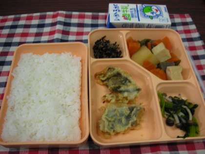 本日は、鯵の天ぷら、厚揚げとこんにゃくの煮物、小松菜としめじのあえもの、牛ひじきそぼろでした。色合いの良い給食です。ニンジンの赤色、あつあげの茶色、ひじきの黒色、小松菜の緑色と目に優しさを与えてくれます。