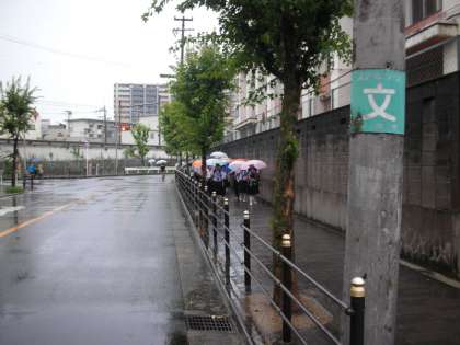 本日の登校風景の写真です。強い雨が降っている中を小学生も中学生も傘をさして登校してきます。傘をさす分だけ、荷物が増えます。蒸し暑い中の登校です。みんな頑張っています。