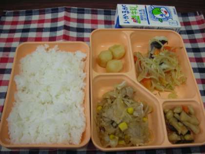 本日の給食は、『献立表』によると、注目メニューになっています。白身魚のちゃんちゃん焼き風、豚肉の炒め煮、揚げポテトもち、五目豆でした。