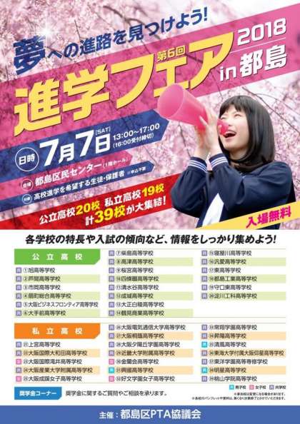 明日、7月7日(土)午後1時から都島区民センターで、『進学フェア2018 in 都島』(都島区PTA協議会主催)が開催されます。公立高等学校20校、私立高等学校19校が大集結し、生徒や保護者の皆さんの様々な疑問にお答えくださいます。