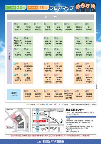 この時期に進学フェアを開催するのは、「自分の進路に悩んでいる生徒たちが、この進学フェアに参加して、目標に向かってやる気をおこしてもらう、そういう機会になってほしい。そしてこれから始まる夏休みを有意義に過ごしてほしい」という、都島区PTA協議会の総意として実施されます。一人でも多くの生徒・保護者の皆さんの参加をお待ちしています。