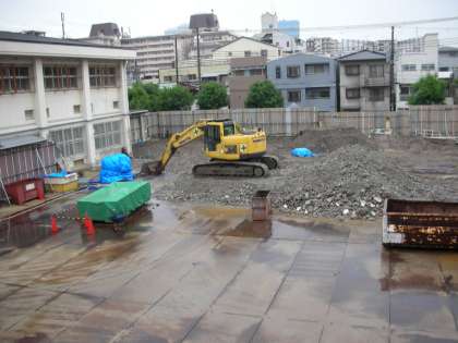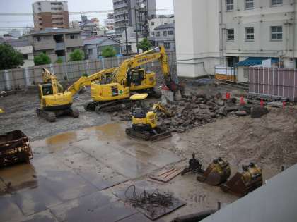 さて、写真は、工事現場の写真です。工事が始まる前のものです。これらの重機は、ショベルやハサミの部分を地面につけるようにして、駐車されています。まるで首長恐竜が頭を地面につけるように、眠っているかのようです。すやすやと眠っているように見えます。十分休息して、エネルギーを蓄えてほしいものです。